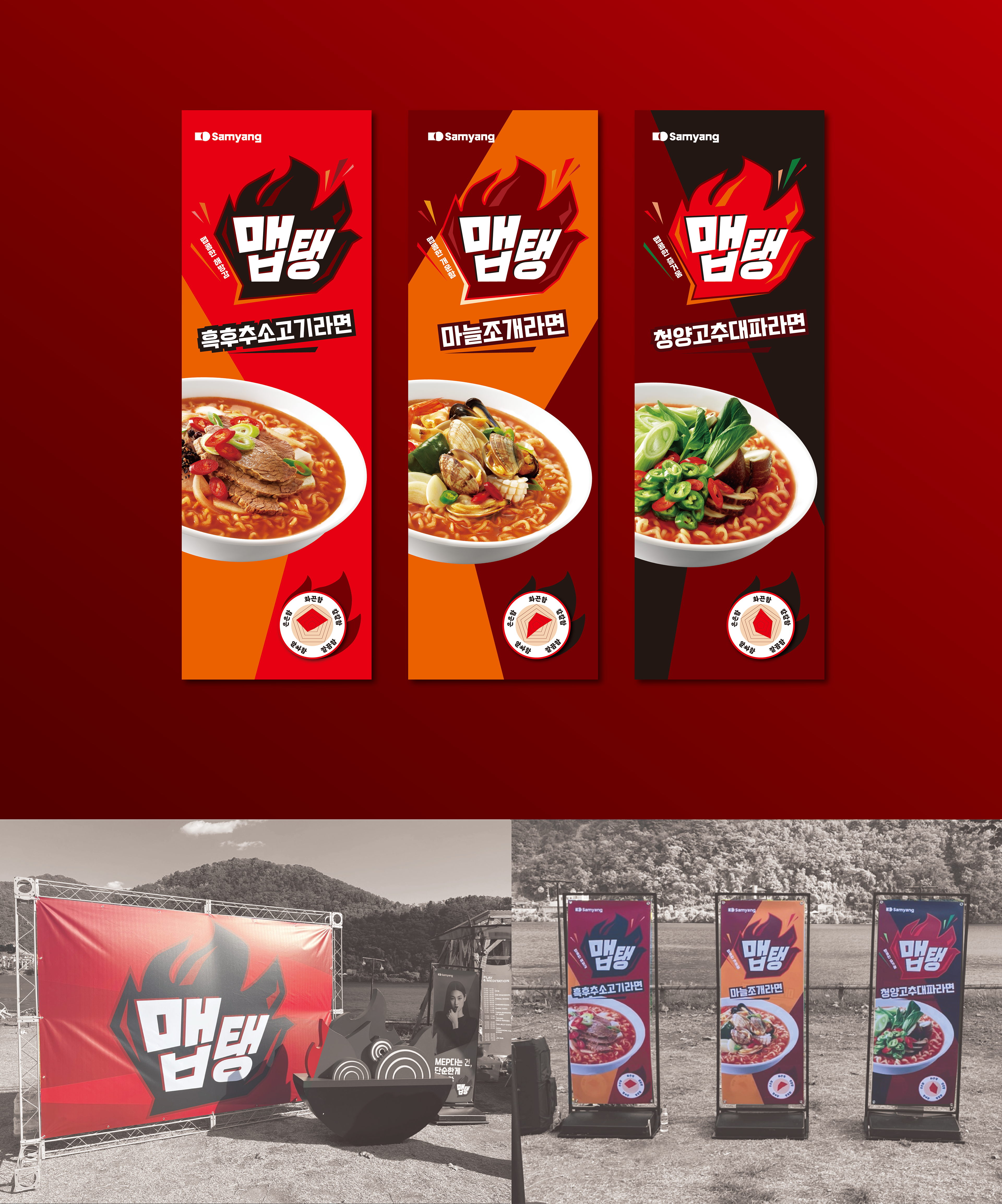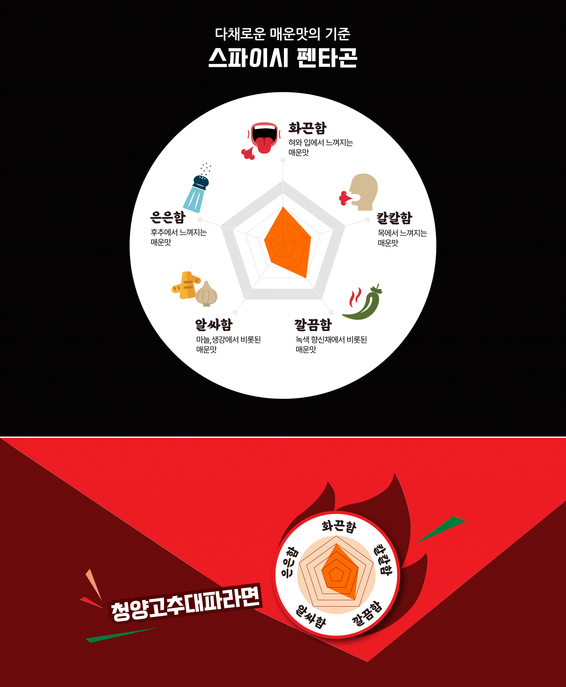 삼양에서 개발한 다채로운 매운맛의 새로운 기준 '스파이시 펜타곤'에 맞추어 강렬한 불꽃 BI를 개발하고 각각의 매운맛에 어울리는